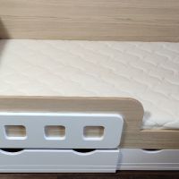 кровать понравилась, очень устойчивая, при перемещении (чтобы убраться за кроватью) двигается легко (у нас паркет) на маленьких пластиковых опорах. подлокотики тоненькие на замке. ящики по размеру не вовсю ширину кровати, но вместительные. единственный минус это то, что ящики идут внахлёст друг другу. размер матраса 80*160*12 очень хорошо подошёл