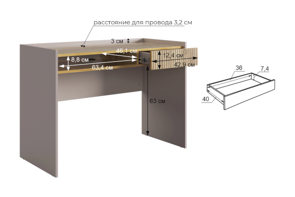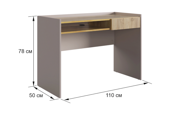 Корпус стола выполнен в цвете кашемир, что придает ему современный и спокойный вид, легко сочетающийся с любым интерьером. Выкатной ящик в цвете "дуб крафт золотой", декорирован принтом, имитирующим вертикальную фрезеровку, что добавляет столу уникальности и роскоши.