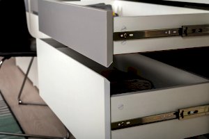Отсутствие лицевой фурнитуры и открывание фасадов за край - это то не только интересное стилевое, но и эффективное функциональное решение. Так мебель занимает меньше места и можно проходить вплотную рядом с фасадом без риска зацепиться за ручку или травмироваться.