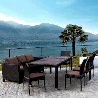 В составе комплекта: стол - столешница декинг, трех местный диван и 5 стульев. Высококачественная лоза из полиротанга коричневого цвета стойкая к любым атмосферным явлениям. Крепкий стальной каркас с полимерным антивандальным покрытием и отличным качеством сварки. Изделие сплетено вручную нашими мастерами под жестким контролем качества на каждом этапе производства. Лоза максимально приближена по рельефу и текстуре к естественному материалу. Идеально подходит для использования на улице и внутри помещения в любую погоду. Не боится воды, солнца и минусовой температуры.