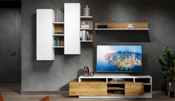 Стенка Невио-2 выполнена с использованием новейшего декора «Дуб крафт золотой» в сочетании с белым - подходит для стилистических направлений лофт, минимализм, скандинавский. Простые формы, естественные природные оттенки создают гармоничную и умиротворенную атмосферу гостиной. Четкая текстура дерева, белый цвет, отсутствие внешней фурнитуры, углубленный цоколь - создают визуальную легкость и компактность стенки. Фасады, выступающие на 1см поверх корпуса, заменяют ручки. Стенку дополняет вместительный комод с витриной. Мебель выполнена из высококачественных экологичных материалов.