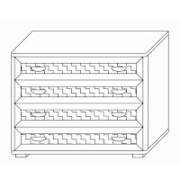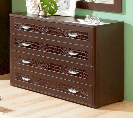 Комод имеет 4 широких (ширина изделия 1050 мм) ящика с декоративными вставками по центру фасадов, которые устанавливаются на телескопические шариковые направляющие полного выдвижения.