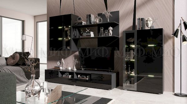 Функциональный и компактный гарнитур Евро прекрасно подойдёт для небольшой гостиной. Модель, ориентированная на удобство и простоту использования. Оригинальные открытые полки, на которых можно разместить фотографии, предметы декора или любимые книги, представляют собой единую ломаную линию удобная зона под ТВ вместительная ниша, скрытая створкой.